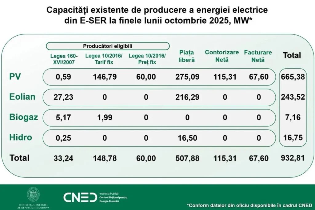 Мы приближаемся к установленной мощности возобновляемых источников энергии в Республике Молдова на уровне 1 ГВт, а текущая динамика указывает на высокую вероятность досрочного достижения целевых показателей, принятых на 2030 год. По состоянию на конец октября 2025 года общая мощность из возобновляемых источников достигла 932,81 МВт. По сравнению с предыдущим месяцем зафиксирован прирост на 35,31 МВт, а по сравнению с концом 2024 года рост составил 353,41 МВт. По отношению к 2020 году, когда было установлено 77,37 МВт, текущий уровень примерно в 12 раз выше, что указывает на структурные изменения в архитектуре электроэнергетической системы и логике принятия инвестиционных решений.