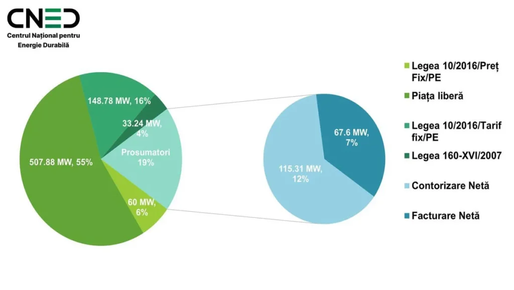 В сегменте более крупных проектов политика государственной поддержки реализуется через несколько инструментов. Режим фиксированного тарифа охватывает 148,78 МВт, что составляет около 16% от общей мощности. Закон № 160/2007 поддерживает 33,24 МВт (около 4%), а механизм фиксированной цены применяется к 60 МВт (примерно 6%). Эти схемы снизили рыночные риски на этапе, когда предсказуемость цен и ликвидность рынка были ниже, облегчив привлечение частного капитала.